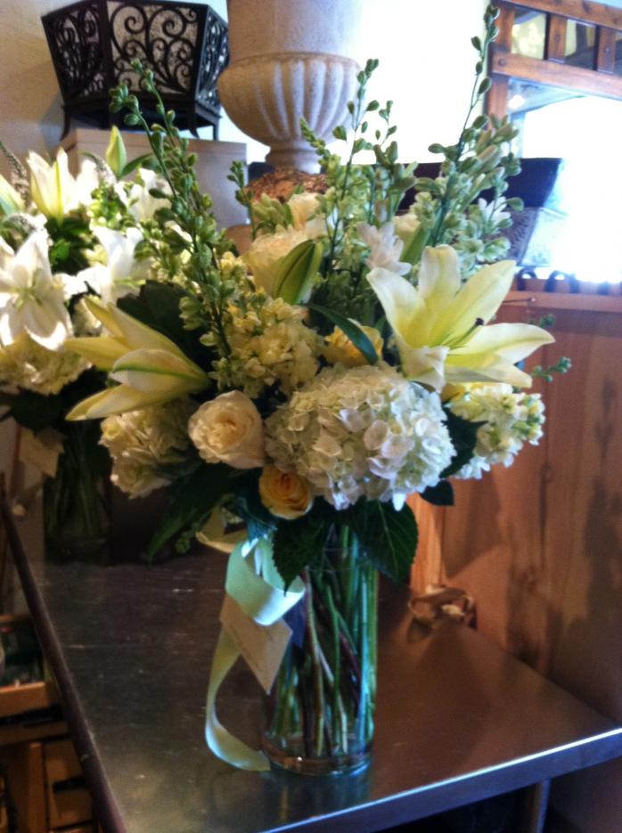 Hydrangea, Lilies, Roses, Larskpur